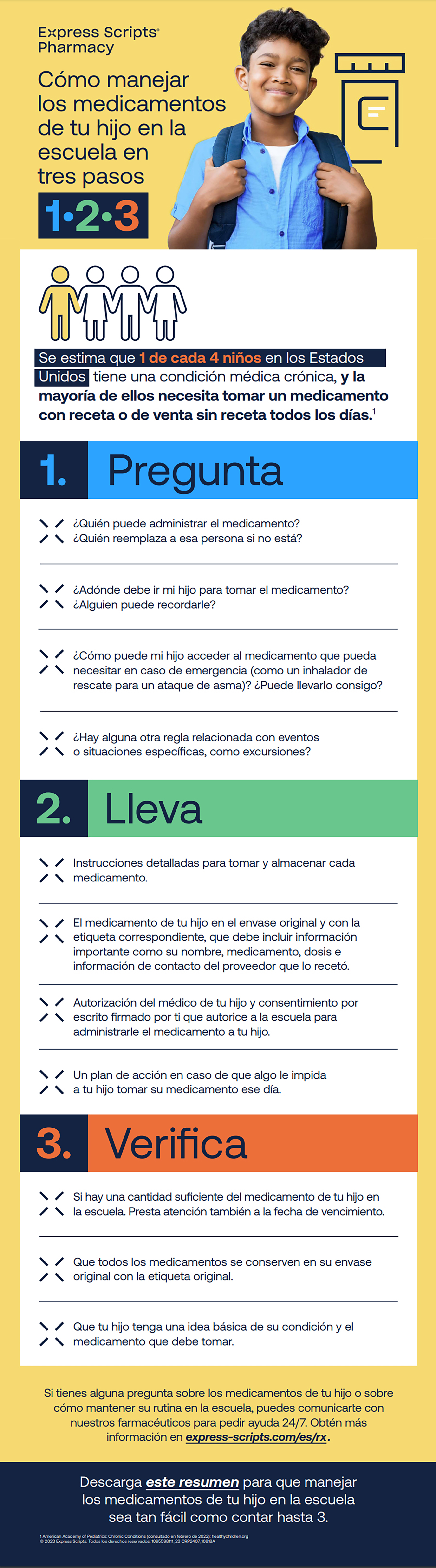 Esta infografía cubre preguntas importantes que deberías hacer, qué deberías llevar a la escuela y cosas que debes verificar minuciosamente. También hay una hoja de notas que puedes descargar o imprimir y completar con información detallada sobre los medicamentos de tu hijo, las normas escolares, instrucciones en caso de emergencia y más.